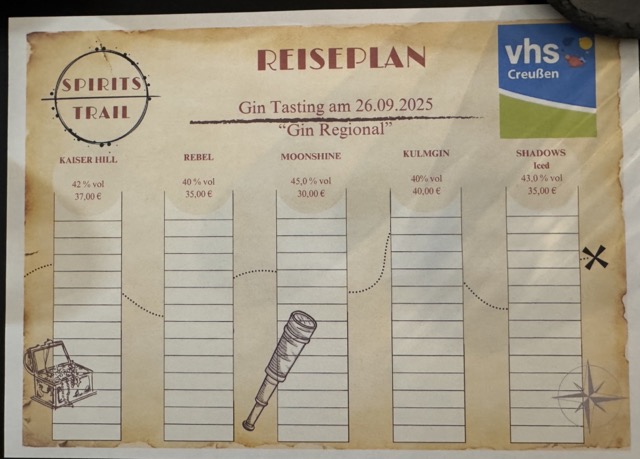 Am 26.08.2025 hatte die VHS Creußen in Kooperation mit Spirits Trail ein Gin Tasting im Angebot. In einer gemütlichen Runde konnten die Teilnehmer und Teilnehmerinnen von Michael Röthlein nicht nur die verschiedensten Geschmacksvariationen des Gin kennenlernen. Michael Röthlein informierte auch darüber, wie Gin hergestellt wird, was Botanicals sind und wie diese Einfluss auf den Geschmack und das Aroma nehmen.